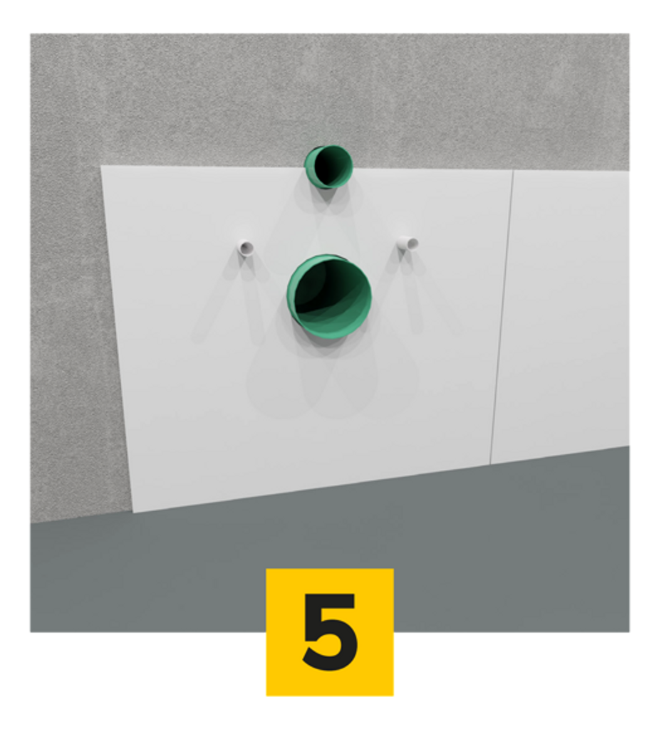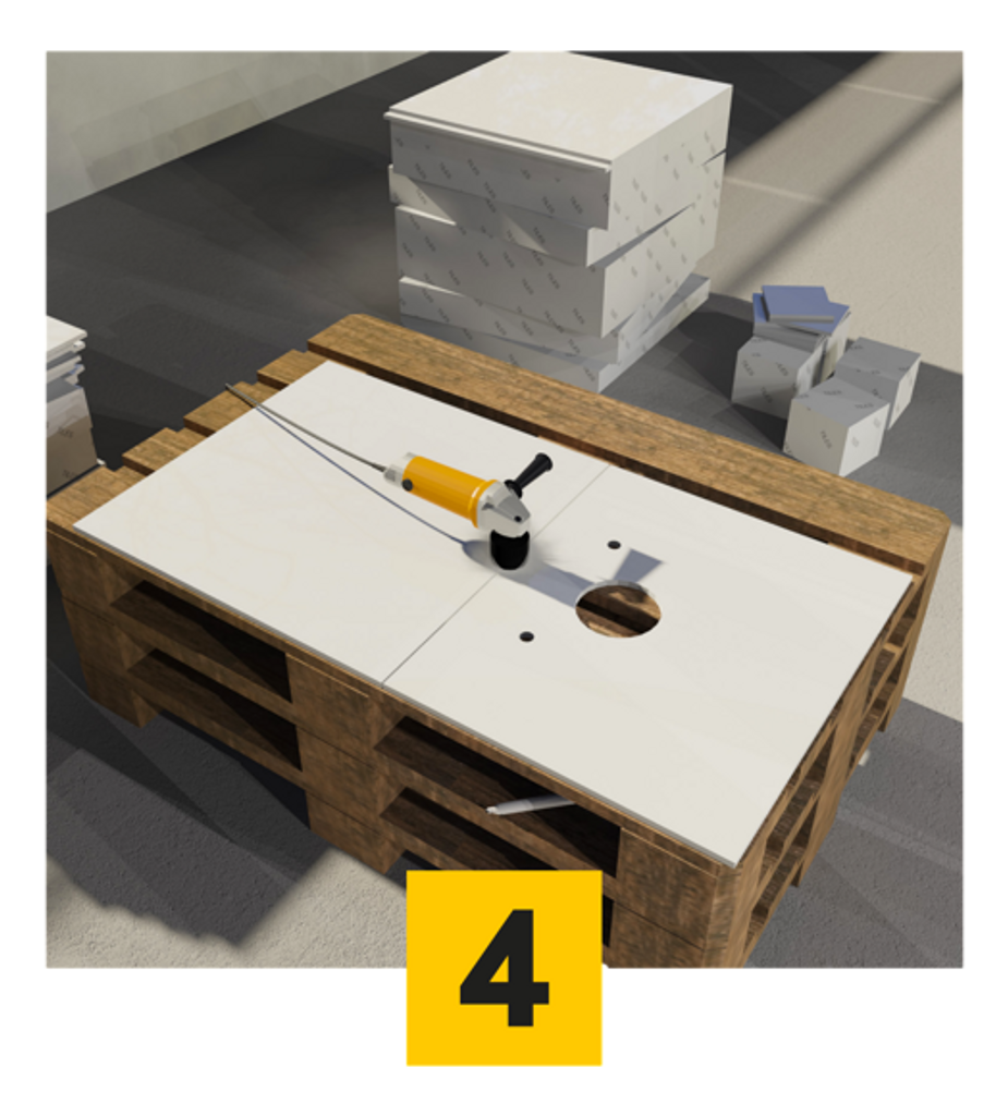 Efter att alla hål har markerats tas Allgrid bort från väggen och placeras över motsvarande kakel/skivor som du har placerat på golvet eller ett bord. Sedan placeras Allgrid över plattorna och markeringen upprepas genom att rita spår runt de magnetiska markörerna. Denna enkla men effektiva process säkerställer kortfattad och exakt skärning av hålen i plattorna.
