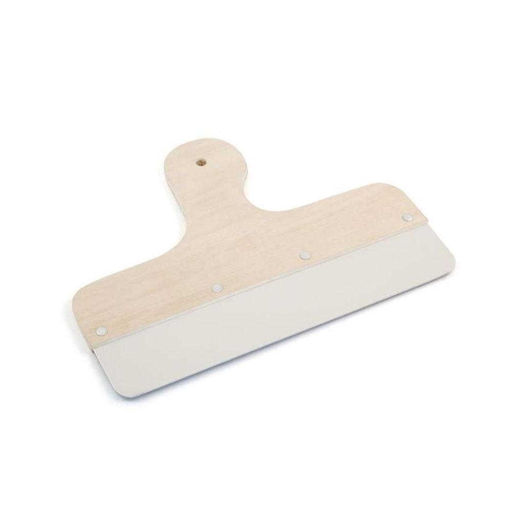 Detta bredspackel är utrustat med ett hållbart trähandtag och ett flexibelt blad av polystyren, vilket gör det perfekt för arbete med våtrumsfolie, vävduk eller liknande ytor. Den lätta konstruktionen ger god kontroll och jämnt tryck vid applicering, vilket förenklar arbetet och minimerar risken för skador på underlaget.