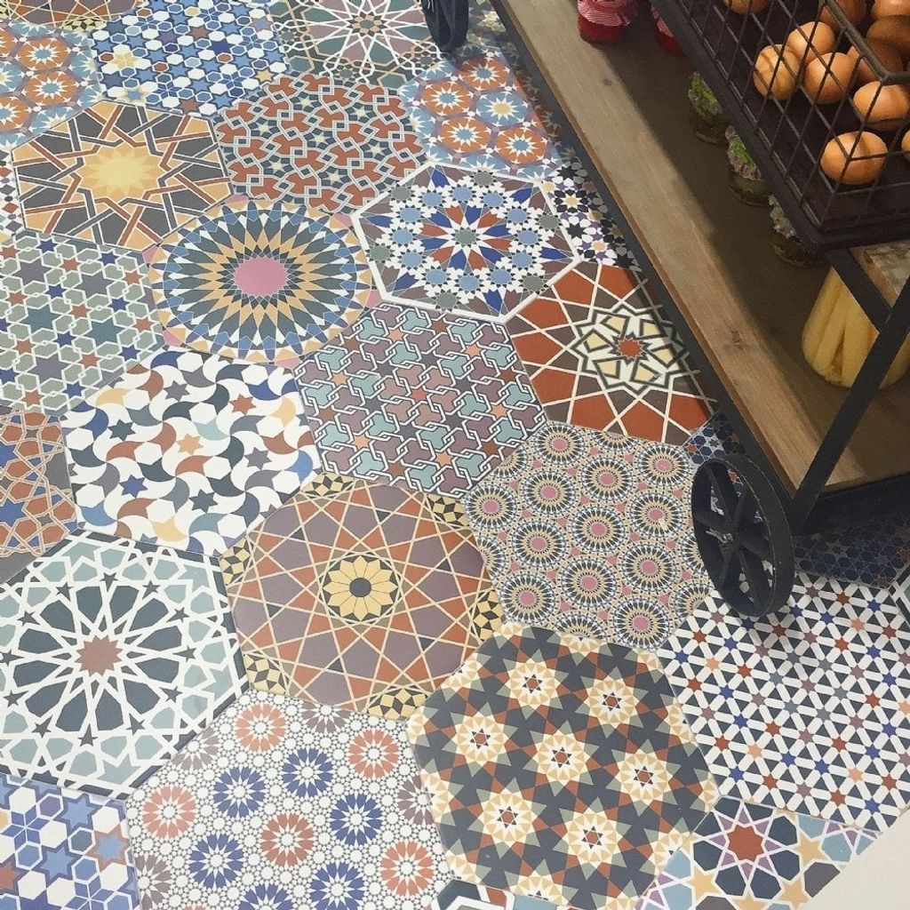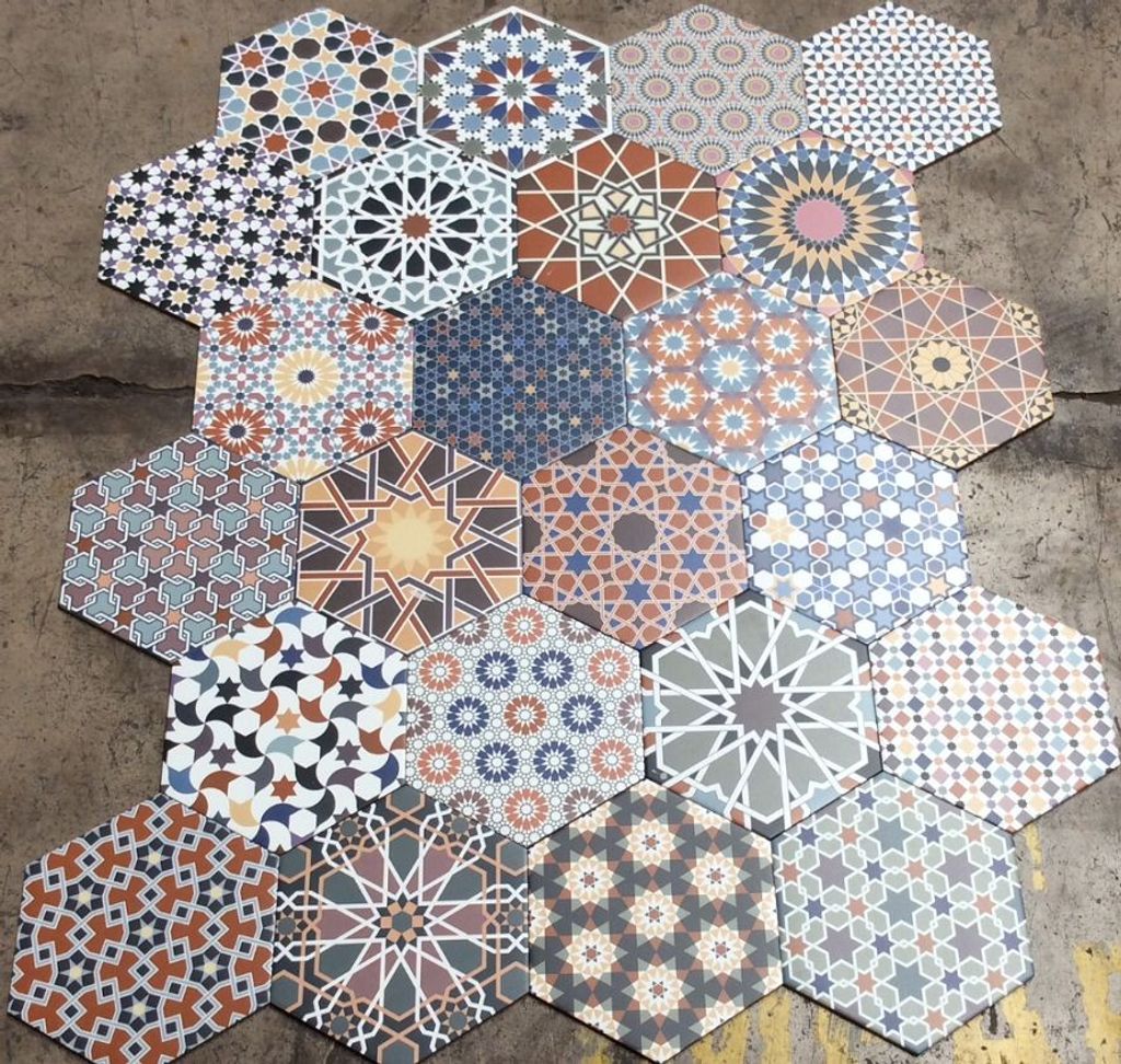 Glädjefull klinker i hexagonformat med olika färgstarka mönster. Klinkern är blandade i mönster och färger!
