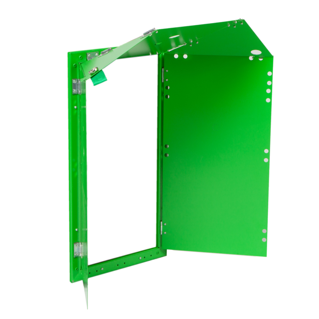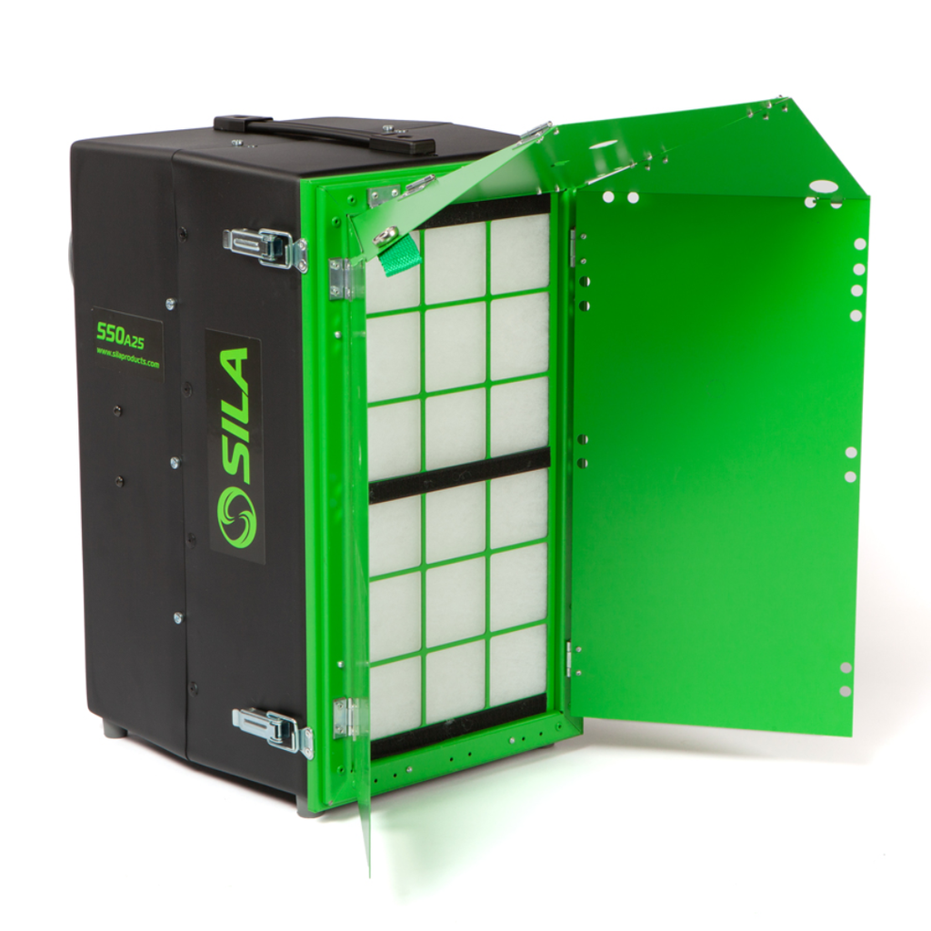 Efter avslutat arbete fälls luckorna ner och fungerar som ett skydd vid transport, vilket gör produkten både funktionell och smidig att hantera. Konstruktionen bygger på Silas patenterade saneringsram och möjliggör tät montering av byggplast. Detta gör det möjligt att skapa en undertryckszon för effektiv dammkontroll vid sanering och rivning.