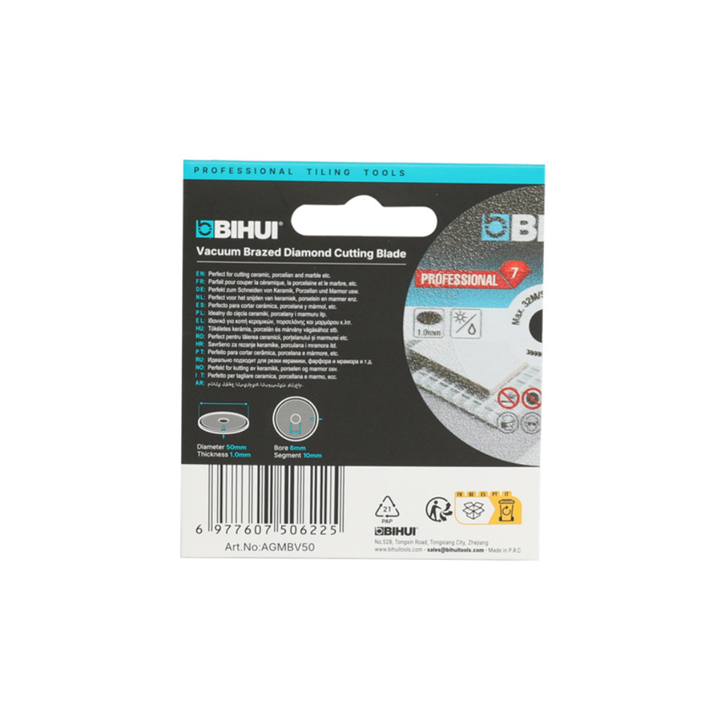 Diamantklinga Bihui AGMBV50 är en kompakt och effektiv klinga för torrkapning, jollykapning och avrundning. Den är utvecklad för att ge rena snitt och god kontroll vid bearbetning av material som kakel, klinker, granitkeramik och marmor.