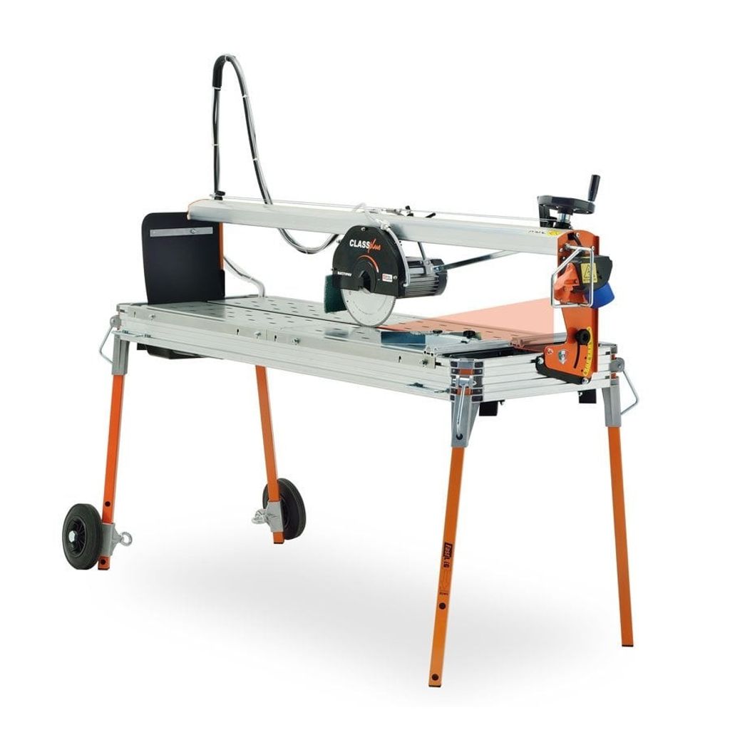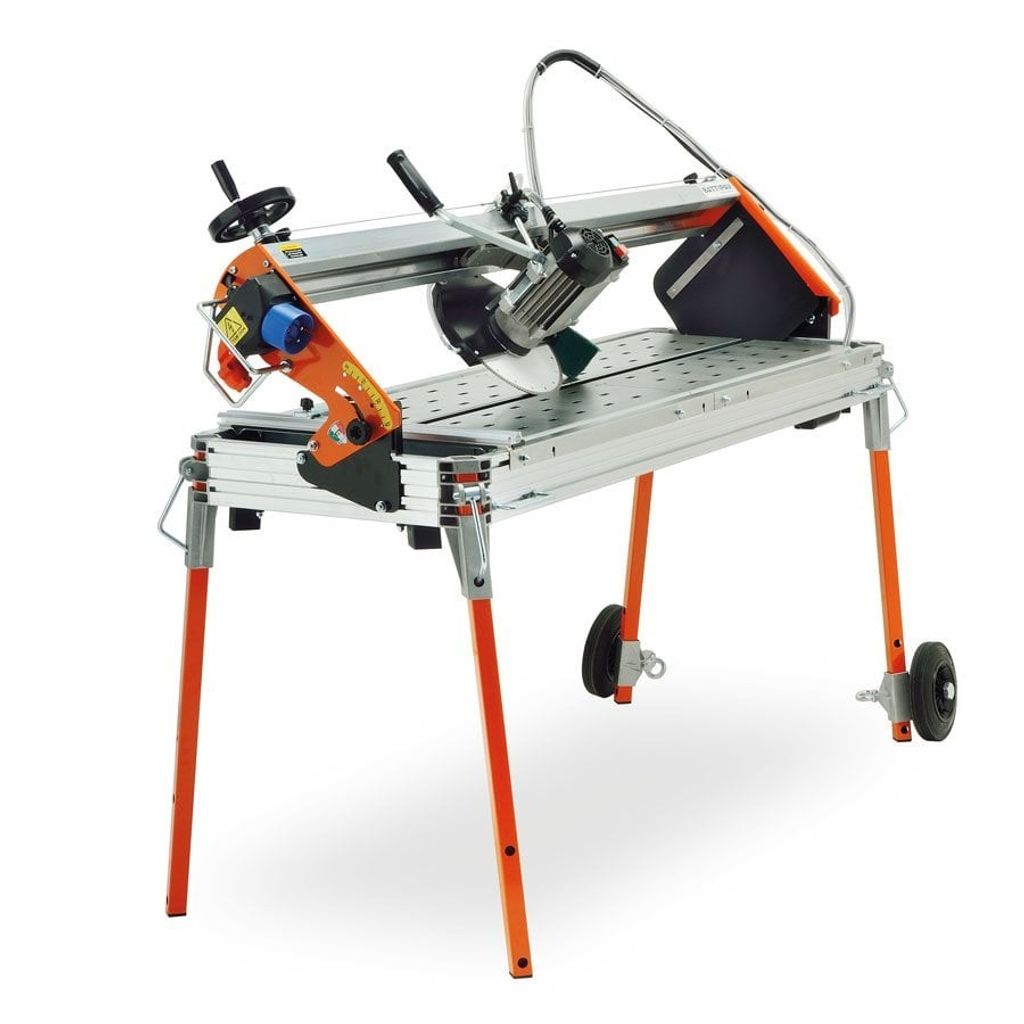 Vattenkyld diamantsåg/vattensåg. 1400 W. För t.ex. kakel, klinker, granitkeramik och marmor. Jollykapning genom vinkling av styrskenan. Höj- och sänkbar motor/klinga. Kullagrad styrskena av aluminium. Chassi och bord av aluminium. Utrustad med vevmatning. Integrerad benställning med hjul. Laser för maximal precision. Levereras med diamantklinga Turbo 250 mm.