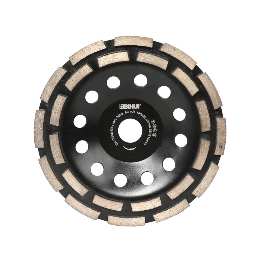 Beskrivning av Diamantslipskål Bihui Dual Diamantslipskål Bihui Dual Diameter: 180 mm Håldiameter: 22,2 mm Segmenttjocklek: 6 mm Hastighet: 8500 rpm