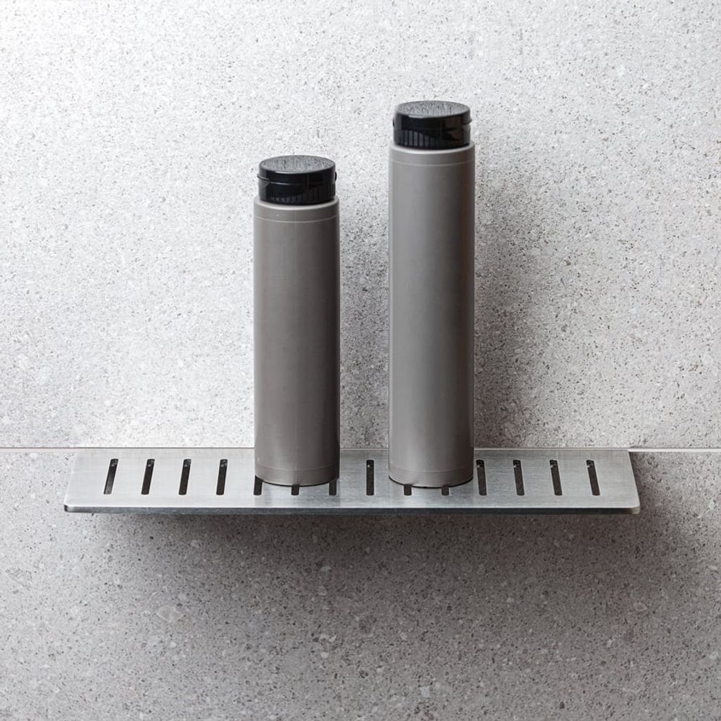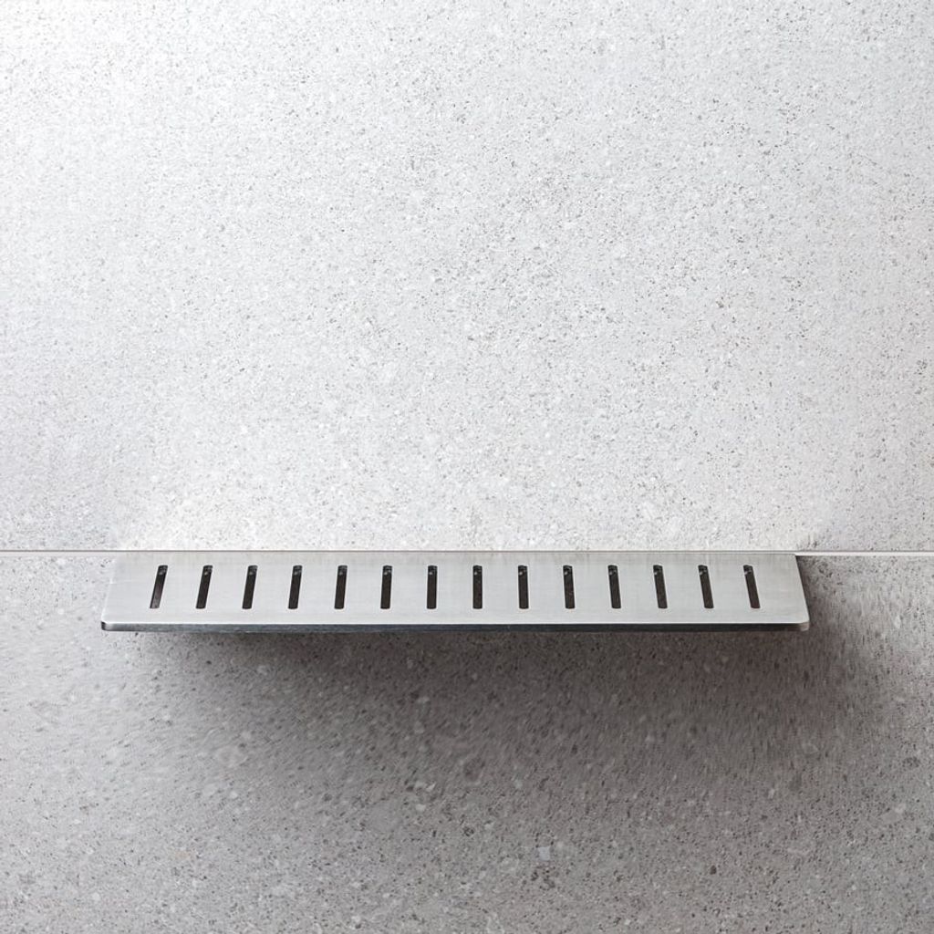 Stilren rak duschhylla av borstat rostfritt stål typ AISI 304. Hyllans kant fästs bakom plattan i samband med plattsättning. Godstjocklek: 4,3 mm. Ej syrafast.