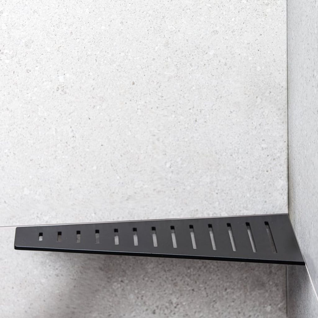 Elegant matt svart pulverlackerad duschhylla av rostfritt stål typ AISI 304. Godstjocklek: 4 mm. Hyllan fästs i fogen med silikon. Passar i 90° hörn. Ej syrafast.
