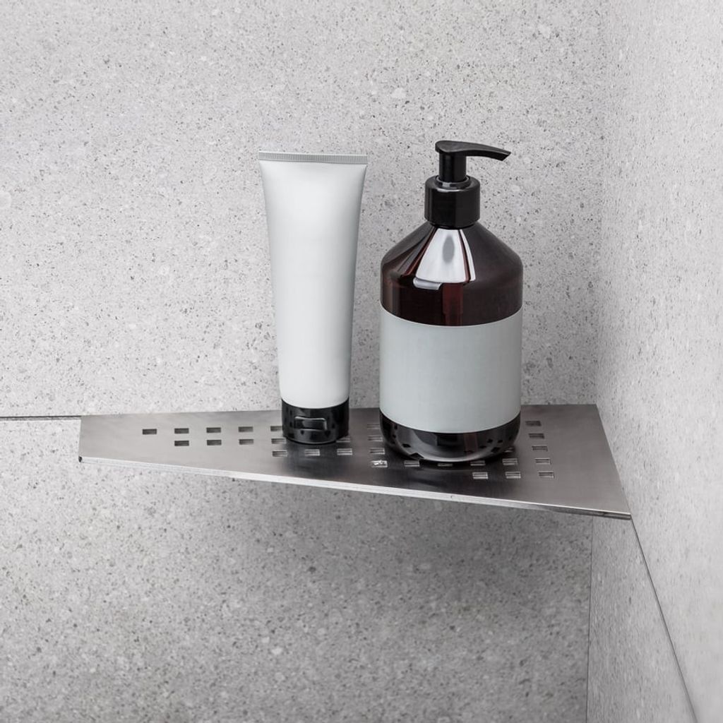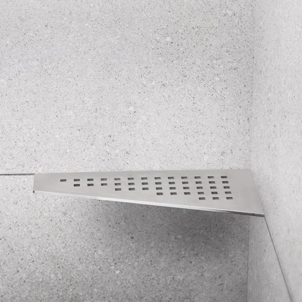 Elegant duschhylla av borstat rostfritt stål typ AISI 304. Godstjocklek: 4 mm. Hyllan fästs i fogen med silikon. Passar i 90° hörn. Ej syrafast.