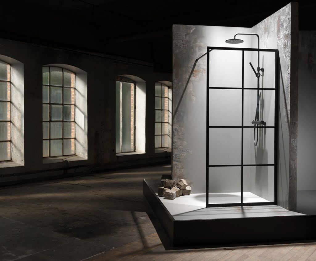 Empire är med sina mattsvarta aluminiumprofiler runt hela glaset och 6 mm härdat klarglas en robust dusch med industriell design.