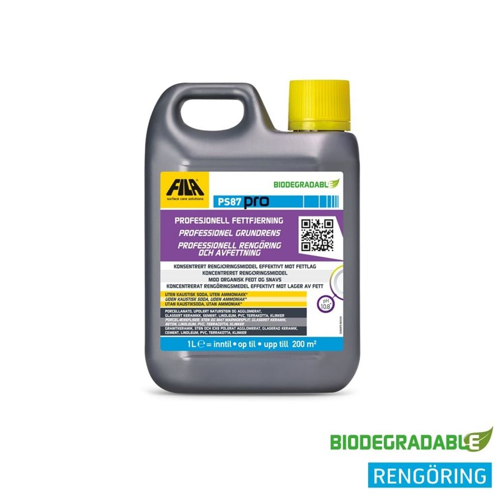 Fila PS87 Pro är ett professionellt rengöringsmedel som kombinerar rengöring, fläckborttagning och avvaxning i ett och samma produkt. Den är särskilt effektiv mot olja, fett och andra fläckar på keramiska ytor, och kan även användas för vaxborttagning och djuprengöring.