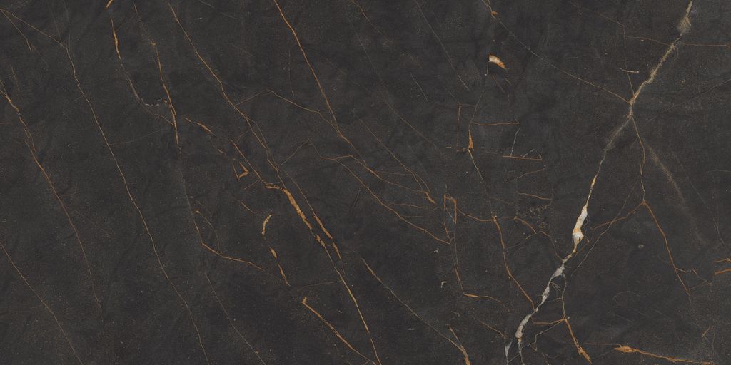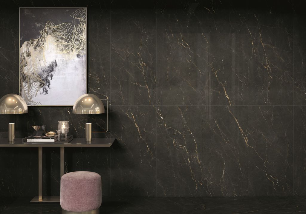 Svart marmorinspirerad granitkeramik med inslag av guldiga vener.