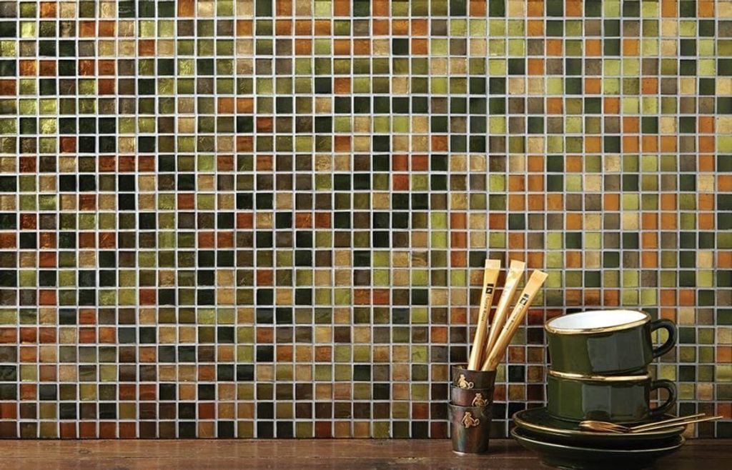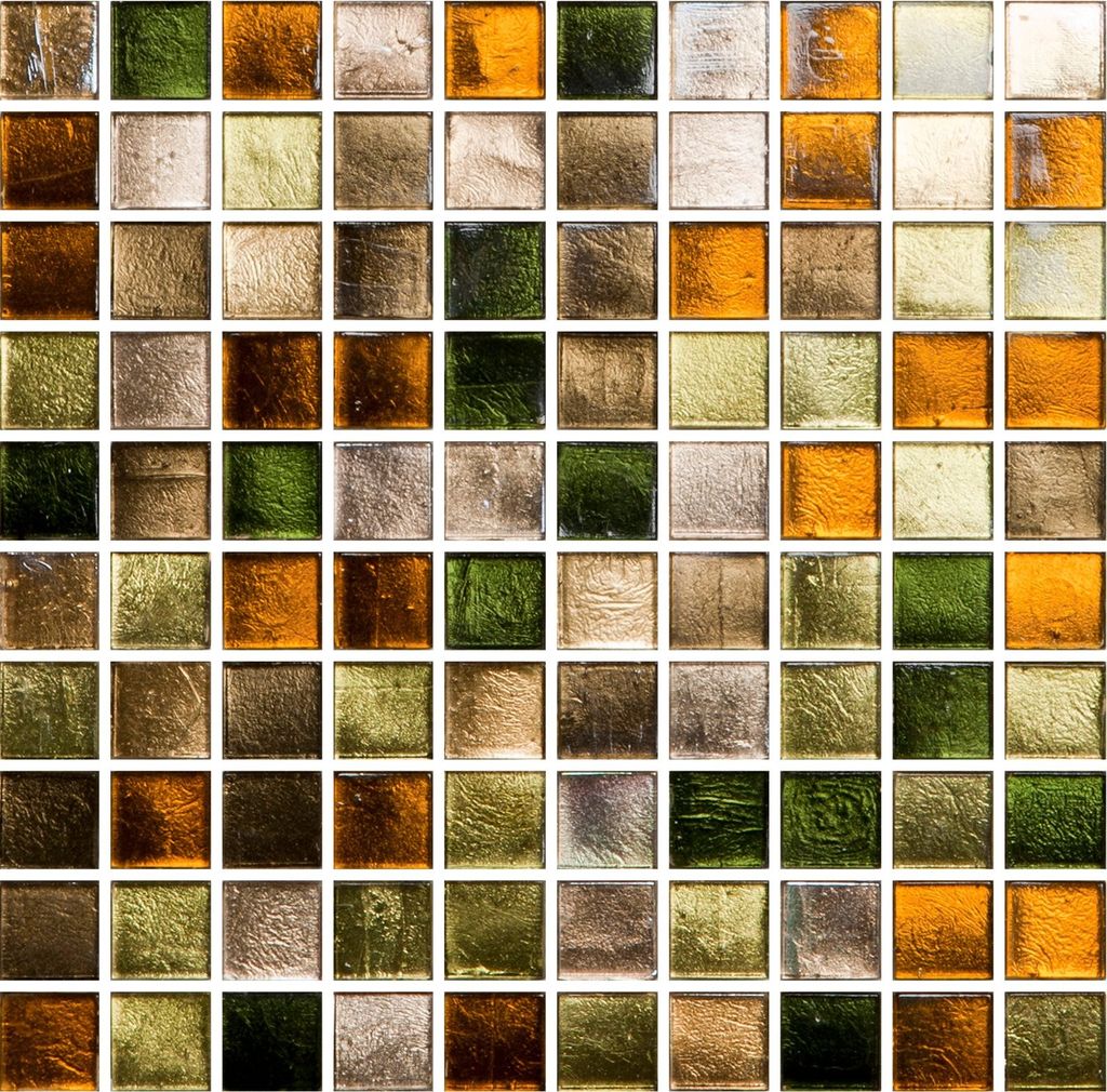 Glasmosaik i formatet 1,5x1,5 cm med metallmix i gröna guldiga och orange toner. Monterad på glasfibernät och avsedd för dekorativa väggytor i torrare miljöer.