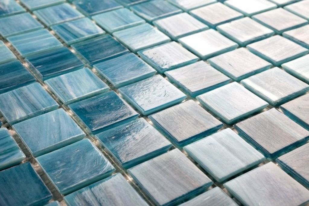 Blåmelerad glasmosaik i formatet 2x2 cm monterad på glasfibernät. Ett levande mosaikkakel som passar för badrum dusch kök och dekorativa väggytor inomhus och utomhus.