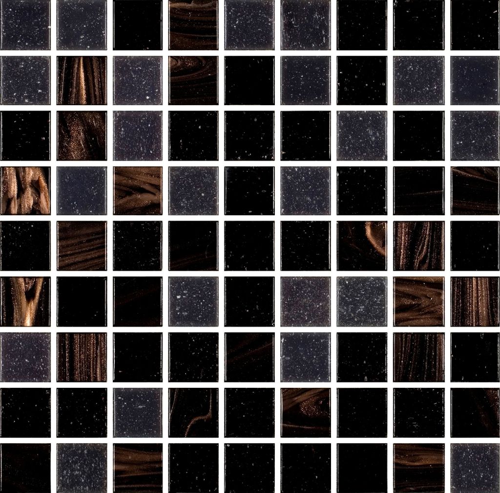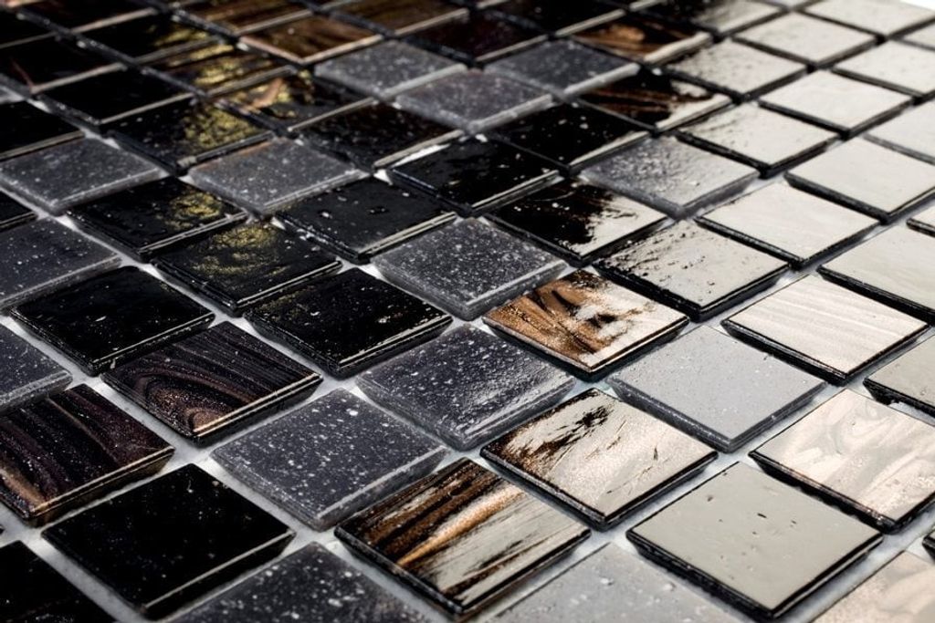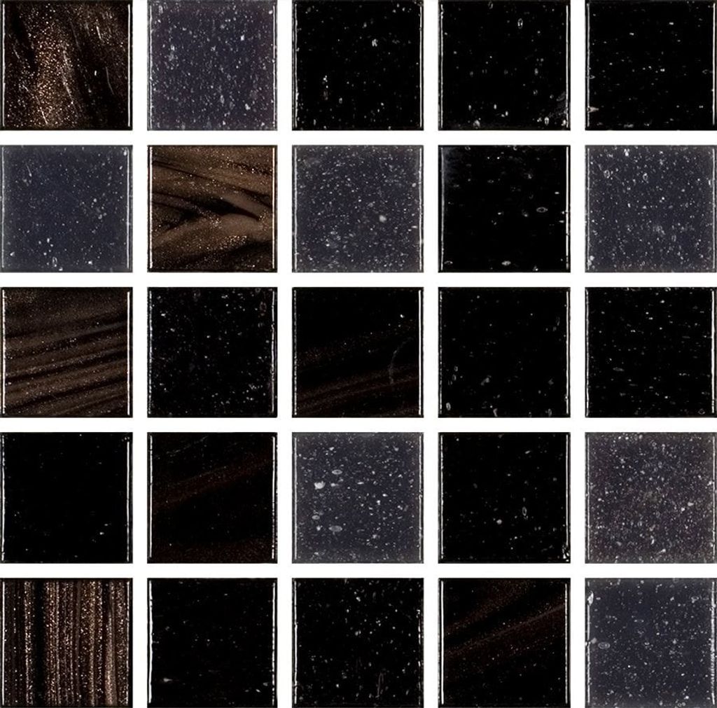 Glasmosaik i formatet 2x2 cm med mix av svarta bruna och grå nyanser samt guldinslag. Monterad på glasfibernät och passar för dekorativa väggytor i badrum dusch och kök.