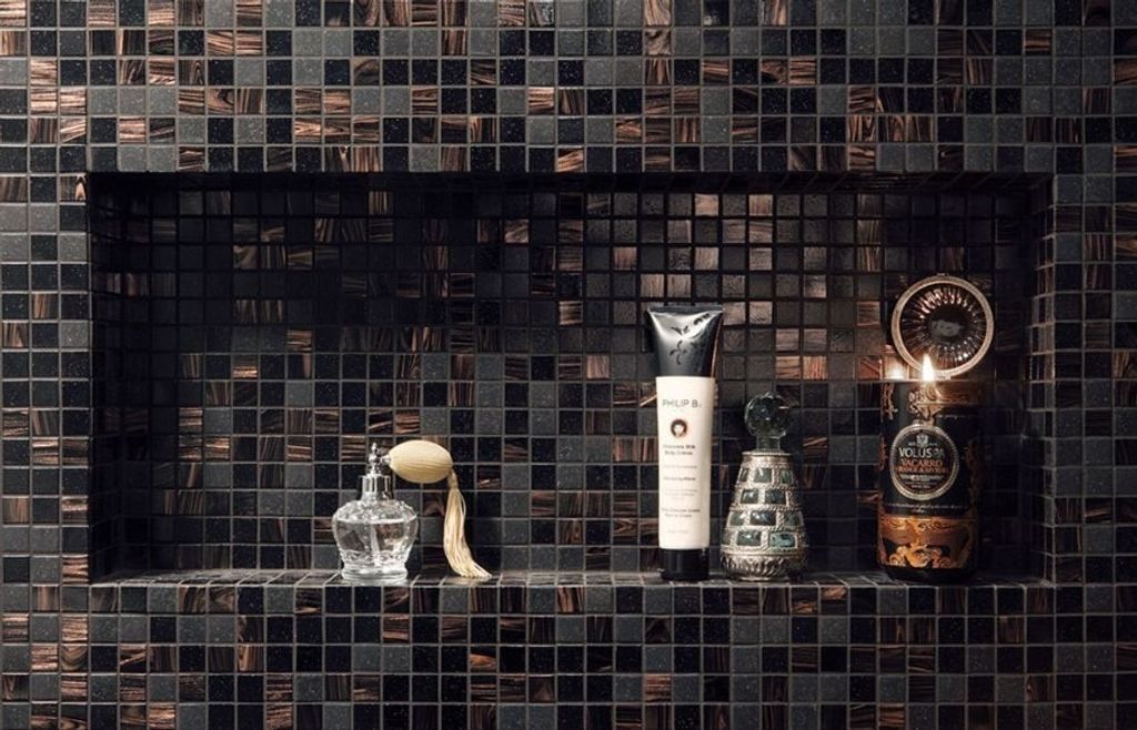 De mörka färgerna i kombination med guldinslagen gör att valet av fog har stor påverkan på slutresultatet. En mörk eller matchad fog ger ett sammanhållet uttryck medan en ljusare fog framhäver mosaikens mönster och kontraster.