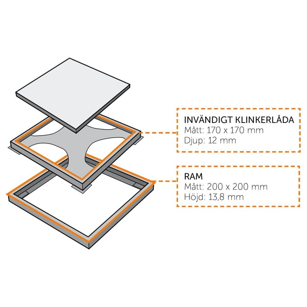 Stilren golvbrunnssil med ram för montering av klinker. Tillverkad av pulverlackerat rostfritt stål typ AISI 304 med STONE-finish i färgen mörk granit. Består av två delar: Klinkerram och klinkerlåda. Godstjocklek: 0,8 mm.