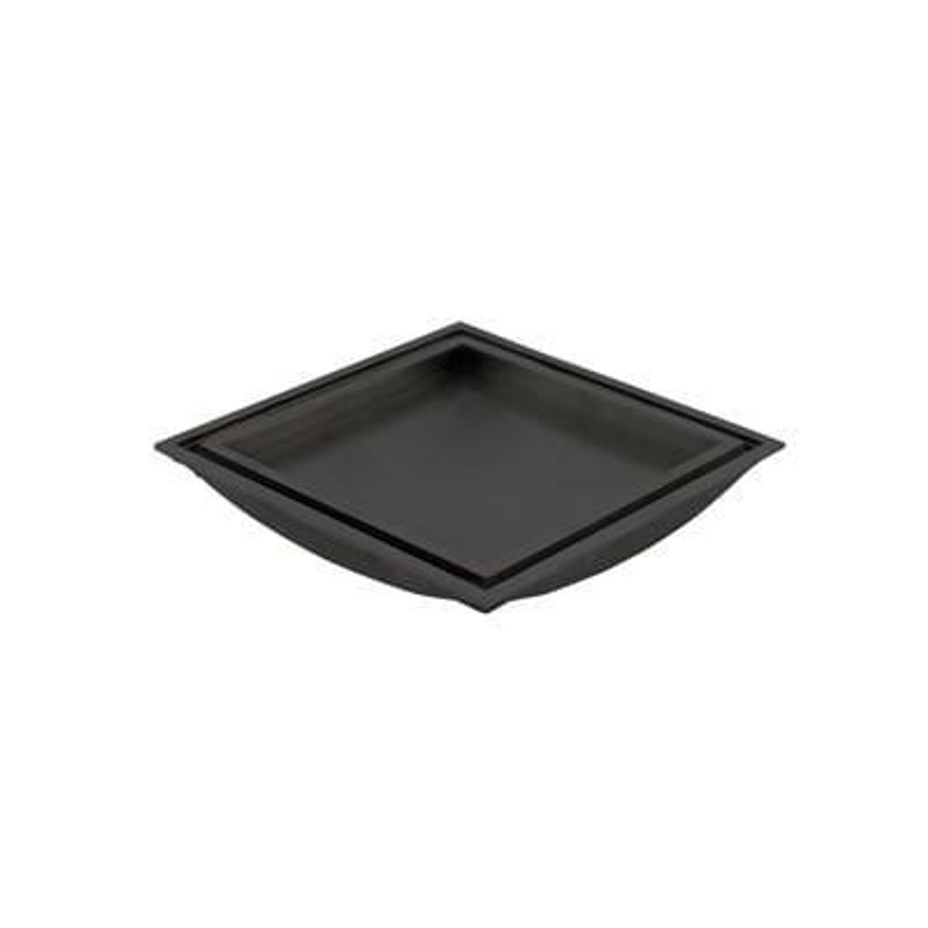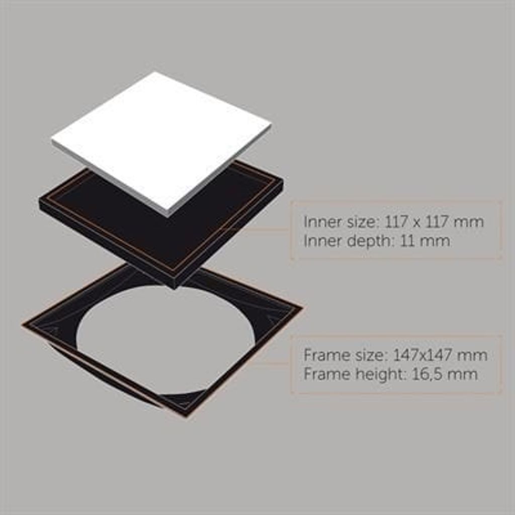Golvbrunnssil med ram för montering av klinker. Tillverkad av svart pulverlackerat rostfritt stål typ AISI 304. Består av två delar: Klinkerram och klinkerlåda. Godstjocklek: 0,8 mm. Vändbar klinkerlåda med en sida för montering av klinker och en med slät svart pulverlackerad yta.