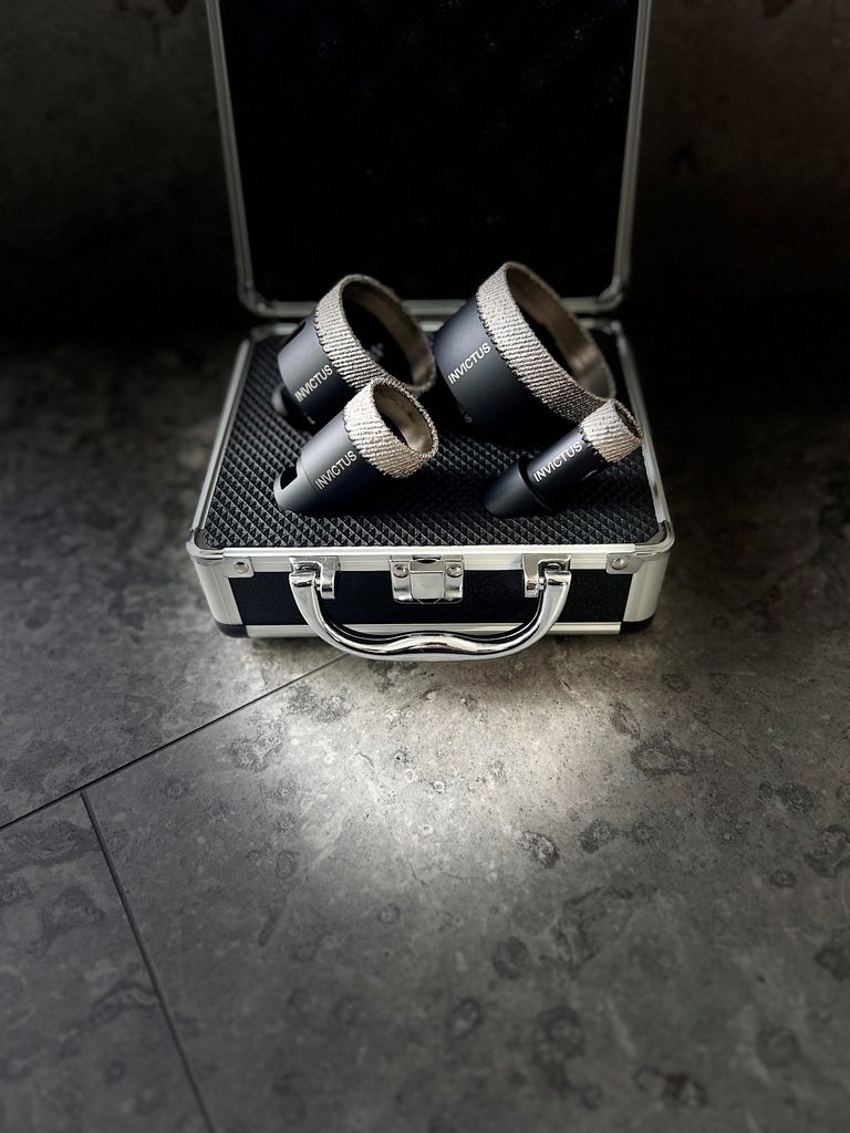 Invictus Diamantborrset är utvecklat för proffs som kräver högsta kvalitet och prestanda. Setet innehåller borrar i storlekarna 20, 35, 55 och 70 mm, designade för torrborrning och möjlig användning med vattenkylning för extra lång livslängd.