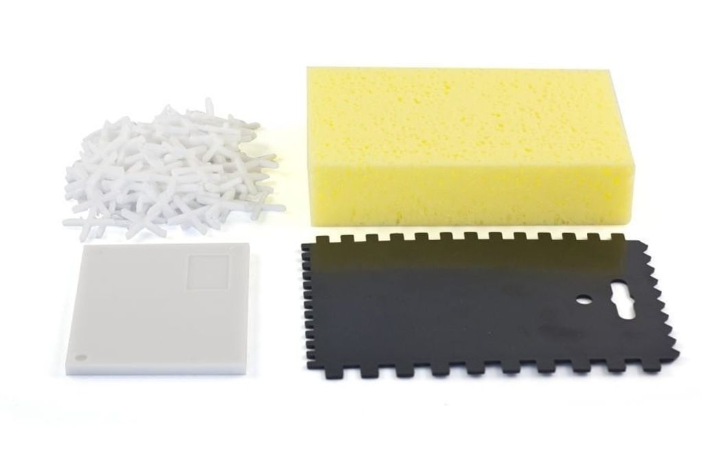 Beskrivning av Kakelset Kök Innehåller 4-sidig fixkam plast, gummispackel, 100 st kakelkryss 3 mm och svamp.