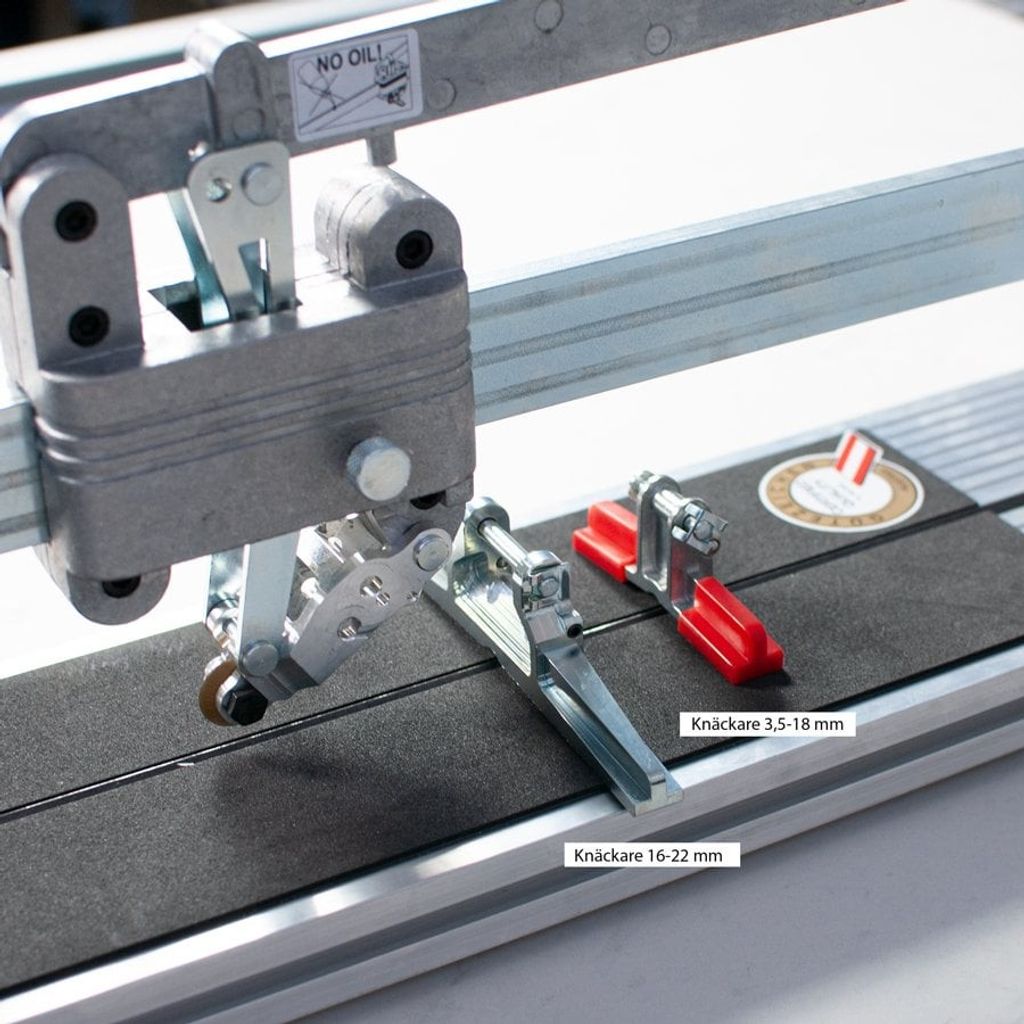Skäraren har kullagrat skärhuvud och 22 mm skärtrissa för precisa snitt på kakel och klinker. Den är försedd med två knäckare för plattjocklek 16–22 mm eller 3,5–18 mm, samt långa handtag som ger jämnt och kraftfullt tryck längs hela plattan. Två stödarmar och gummifötter säkerställer stabilitet och förhindrar glidning. Låsbart skärhuvud gör transport säker och smidig.