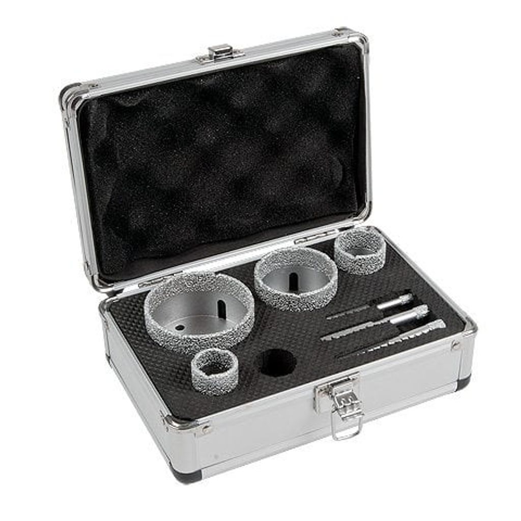 KGC Diamantborrset PREDATOR Maxi Mix är ett mångsidigt set för torrborrning i alla typer av keramiskt material, inklusive granitkeramik. Setet innehåller totalt sju borrar: fyra med fäste för vinkelslip (28, 35, 55 och 70 mm) och tre med chuckfäste (6, 8 och 10 mm). Vid korrekt användning kan borrarna i vinkelslip hålla upp till 100 hål och borrarna med chuckfäste upp till 35 hål. Borren monteras snett mot plattan och förs i cirklande rörelser för att avlägsna borrkax och hålla temperaturen nere. Vattenkylning rekommenderas var femte sekund för chuckborrar.