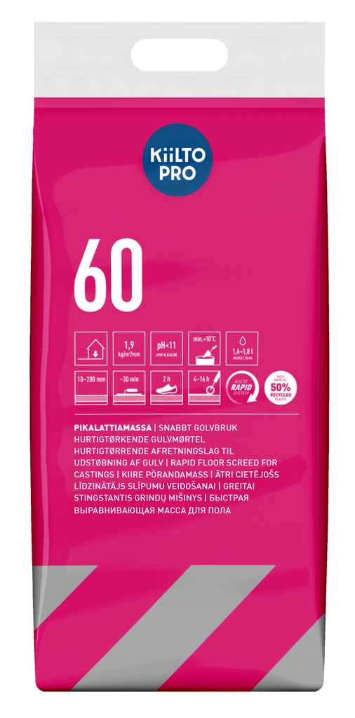 Kiilto 60 - Snabbt golvbruk är ett specialcementbaserat, snabbhärdande och snabbtorkande golvbruk utvecklat för gjutning, ifyllning och fallbyggnation inomhus. Produkten är lågalkalisk, enkel att använda och passar utmärkt för både nyproduktion och renoveringsprojekt.