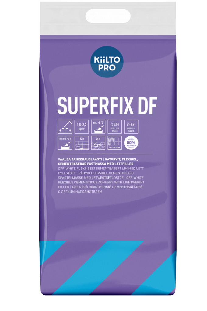 Kiilto Superfix DF är en cementbaserad fästmassa med lättfiller, perfekt för applicering av keramiska plattor och glasmosaik på både golv och vägg. Den dammreducerade tekniken minskar avsevärt damm vid blandning och gör arbetet renare och smidigare.