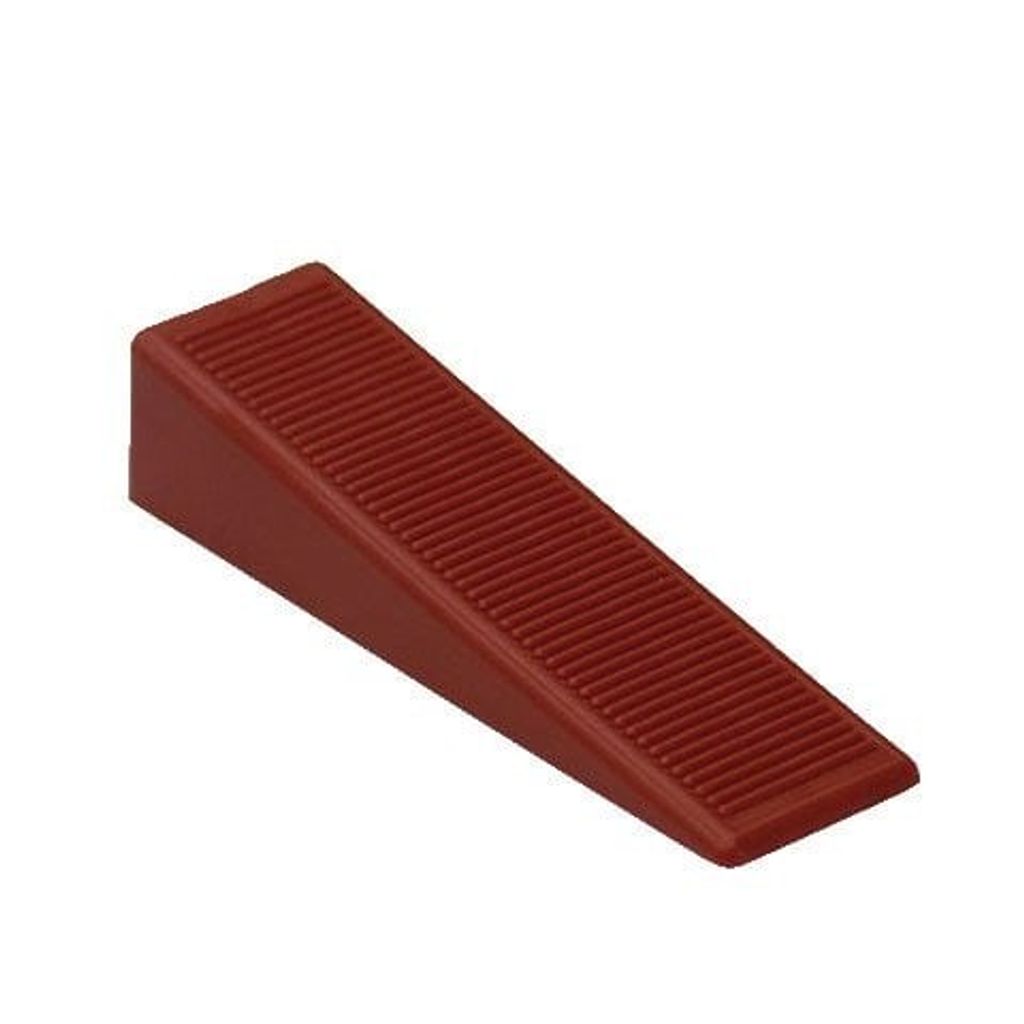 Läggningssystem Level för klinker. Nu är fogsprång ett minne blott! Innehåller: 100-500 stycken nivådistanser. Systemet bygger på att man lägger plattorna i flytfix med någon av följande tandspacklar. 7005, 7002 eller7027. När man kammat ett lägg så trycker man in foten på distansen under plattorna. Nivådistansen fungerar som distans mellan plattorna om man vill ha 1,5 mm fog, vill man ha större fogar använder man kryss eller inget alls och lägger efter linjer som vanligt och som nivåhjälpmedel med hjälp av en kil. Kilen trycks in i det rektangulära hålet i nivådistansen sedan pressas kilen inmed hjälp av en specialtång. Man bör pressa kilarna lite åt gången, på så vis får man en successiv nivåutjämning. Tången har olika inställningar för olika plattjocklek samt ett justerbart stoppanslag. När kilen pressas in tvingar den de två intilliggande plattorna att lägga sig plant och fogsprångenstid är förbi. Eftersom en av plattorna lyfter lite grann så är det av största vikt att man har en ordentlig fixbädd. Systemet fixerar plattorna så bra att man kan sätta ner handen på dem och ta stöd till och med underläggningen. När det blir dags för fogning slår man av distanserna i sidled så går de av under plattorna. Kilarna kan sedan återanvändas om och om igen.