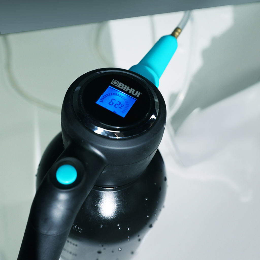 Uppladdningsbart 2 Ah-batteri (3,7 V) som laddas via USB-C. På ovansidan finns en tydlig digital display som visar kvarstående kapacitet i % och på handtaget finns en knapp för start och stopp.