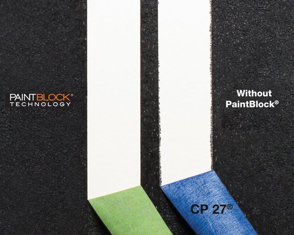 Maskeringstejp med patenterad PaintBlock®-teknik. Tejpens kanter har försetts med PaintBlock®-pulver och vid kontakt med vattenbaserad färg bildas en gelliknande barriär som förhindrar att färgen tränger in under tejpkanten.
