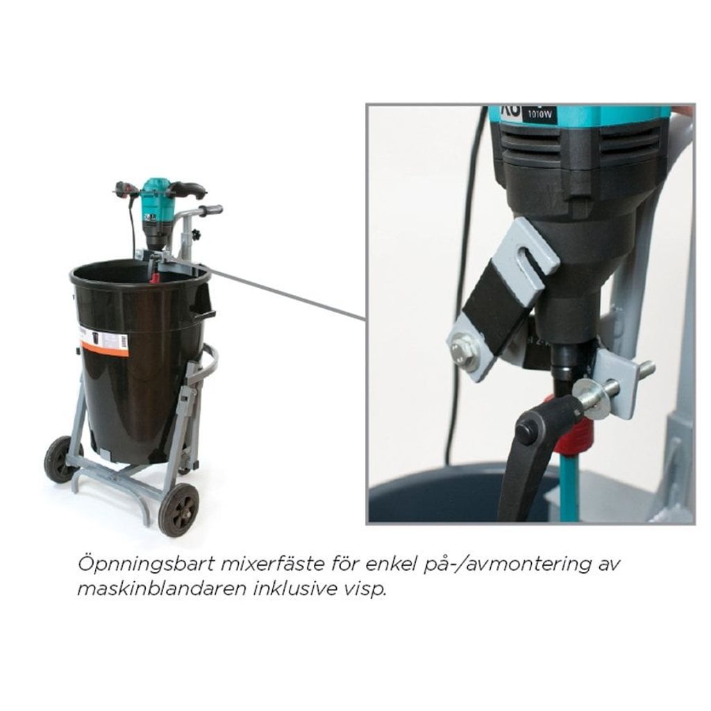 Mixervagnen är utrustad med universalfäste som passar de flesta blandningstunnor på marknaden. Det öppningsbara mixerfästet gör det enkelt att montera och demontera maskinblandare med visp, och vagnen är kompatibel med de vanligaste blandarmaskinerna. Maximal visplängd är 700 mm.