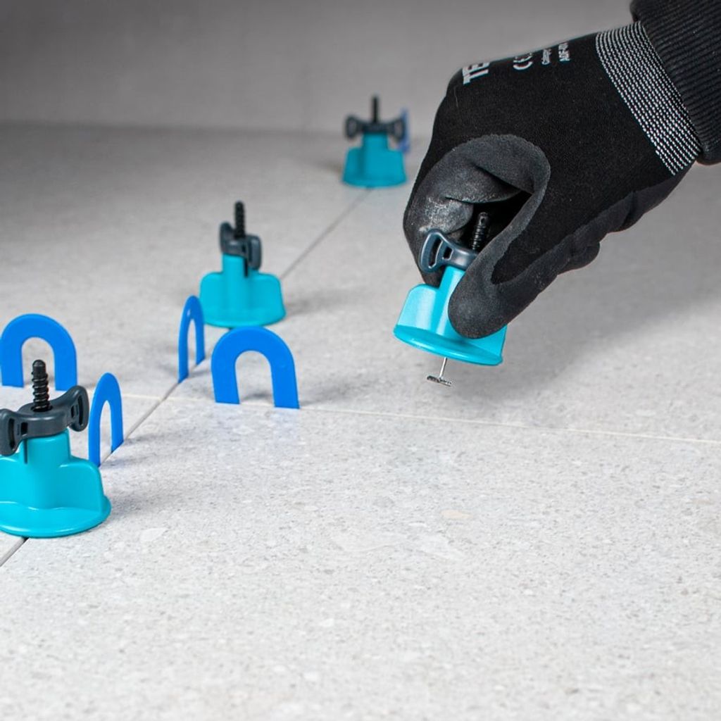 Använd nivåsystemet tillsammans med en fogdistans, t.ex. Fogdistans ”U”, Kakelkryss eller Kakelkil. T-stiftet placeras i fogen, den blå bottenskruven roteras 90° under plattan och den svarta toppskruven skruvas åt för hand tills plattorna ligger i nivå. Systemet kan enkelt efterjusteras vid behov, kräver inga monteringsverktyg och kan återanvändas flera gånger.