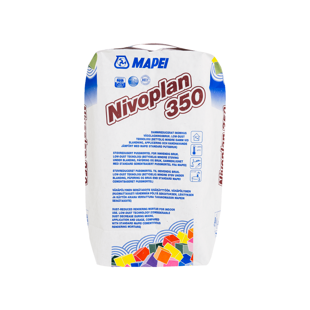 Blandningsförhållande: 100 delar Nivoplan 350 till 18-20 delar vantten (2,7-3,0 liter per 15 kg säck)