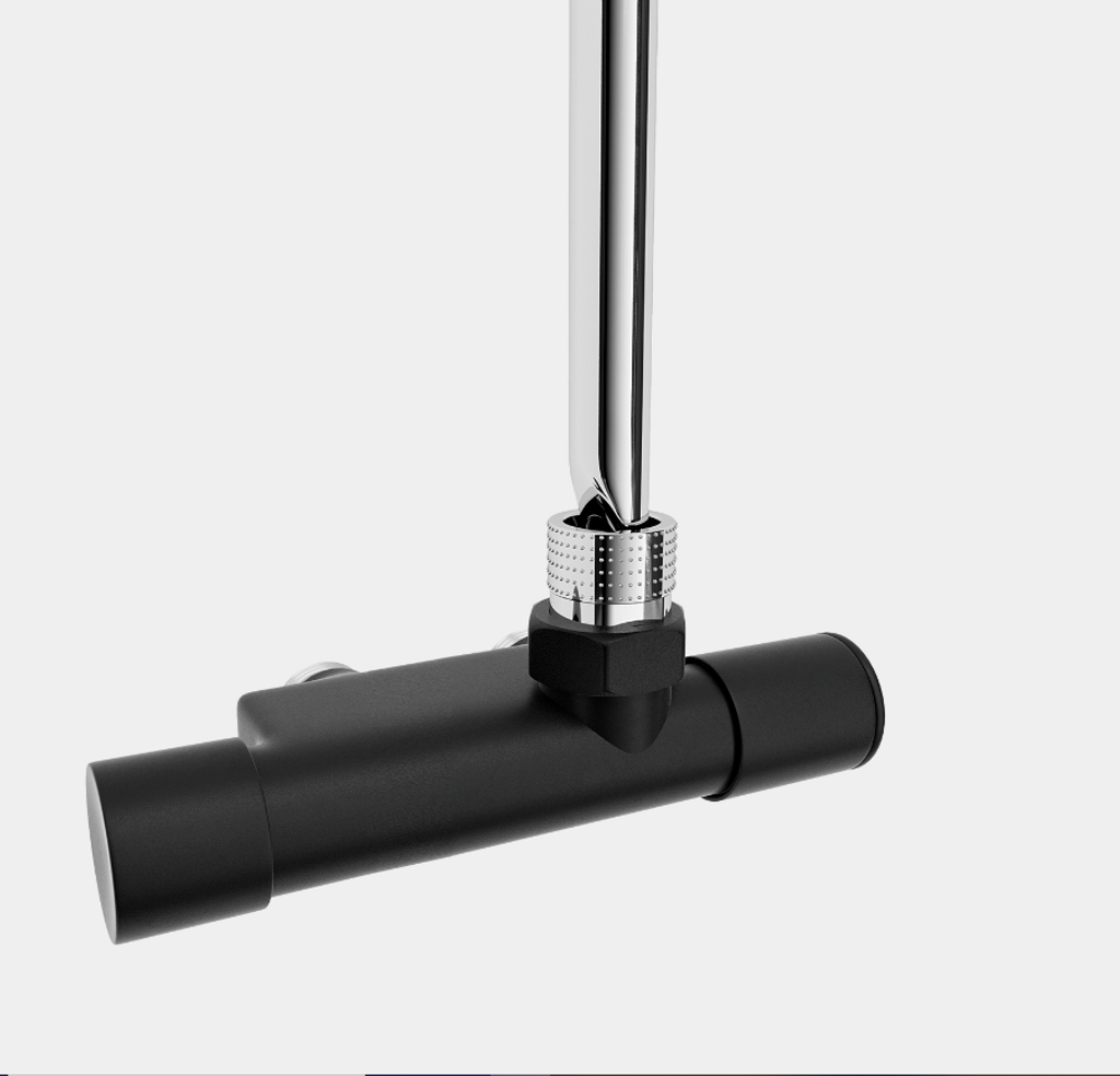 En designad manuell vattenventil för anslutning till vattnet från centralvärmesystemet. Vinklad ventil i högerutförande. 60 c/c mattsvart