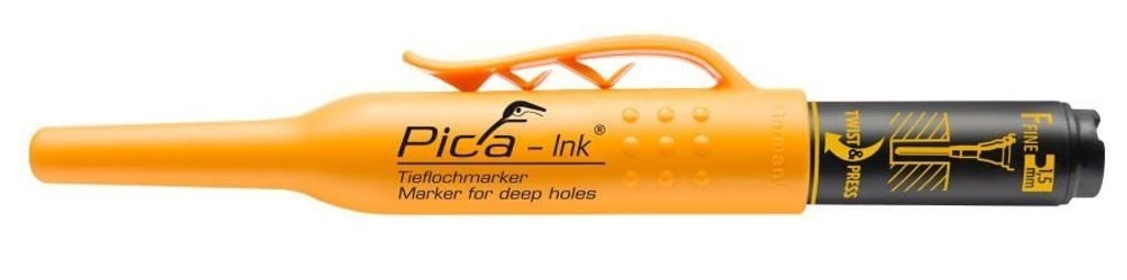 Konstruktionspenna för uppmärkning i djupa hål. Pennan har en 40 mm lång spets i rostfritt stål. Kan användas på de flesta typer av material, även smutsiga och oljiga ytor. Permanent färg.