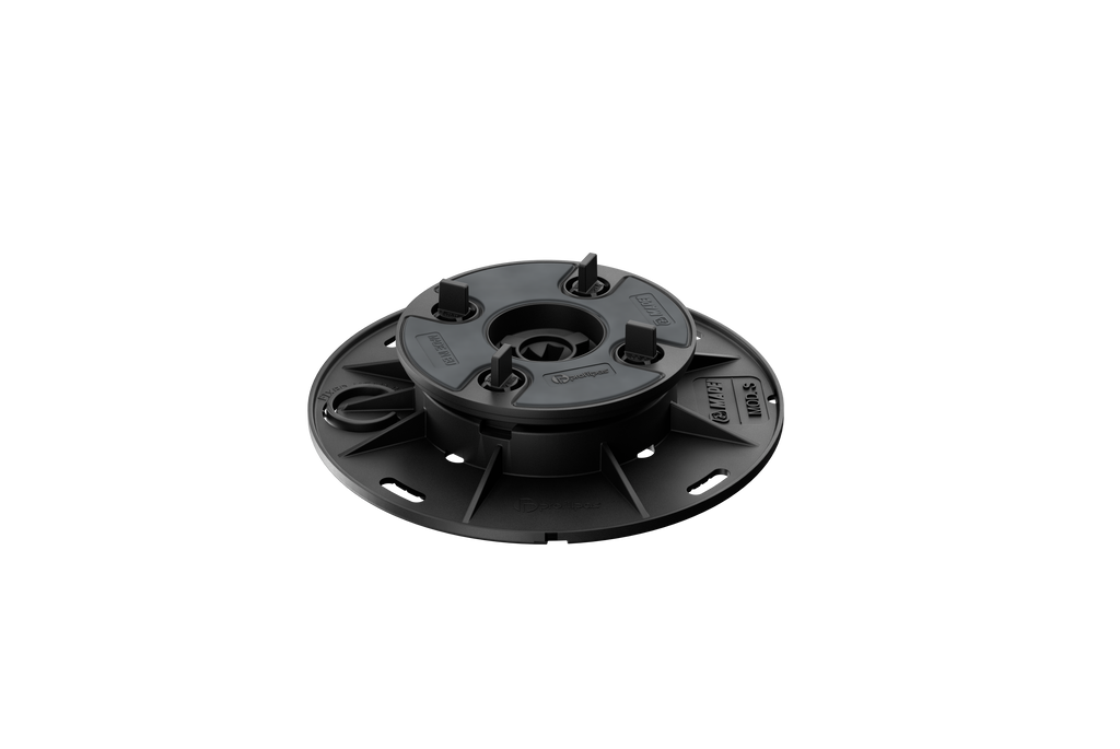 Själnivellerandepiedestal för klinkerdäck av 2CM Granitkeramik. Inbyggd justering 5% lutning. Går även att fixera i fast läge.