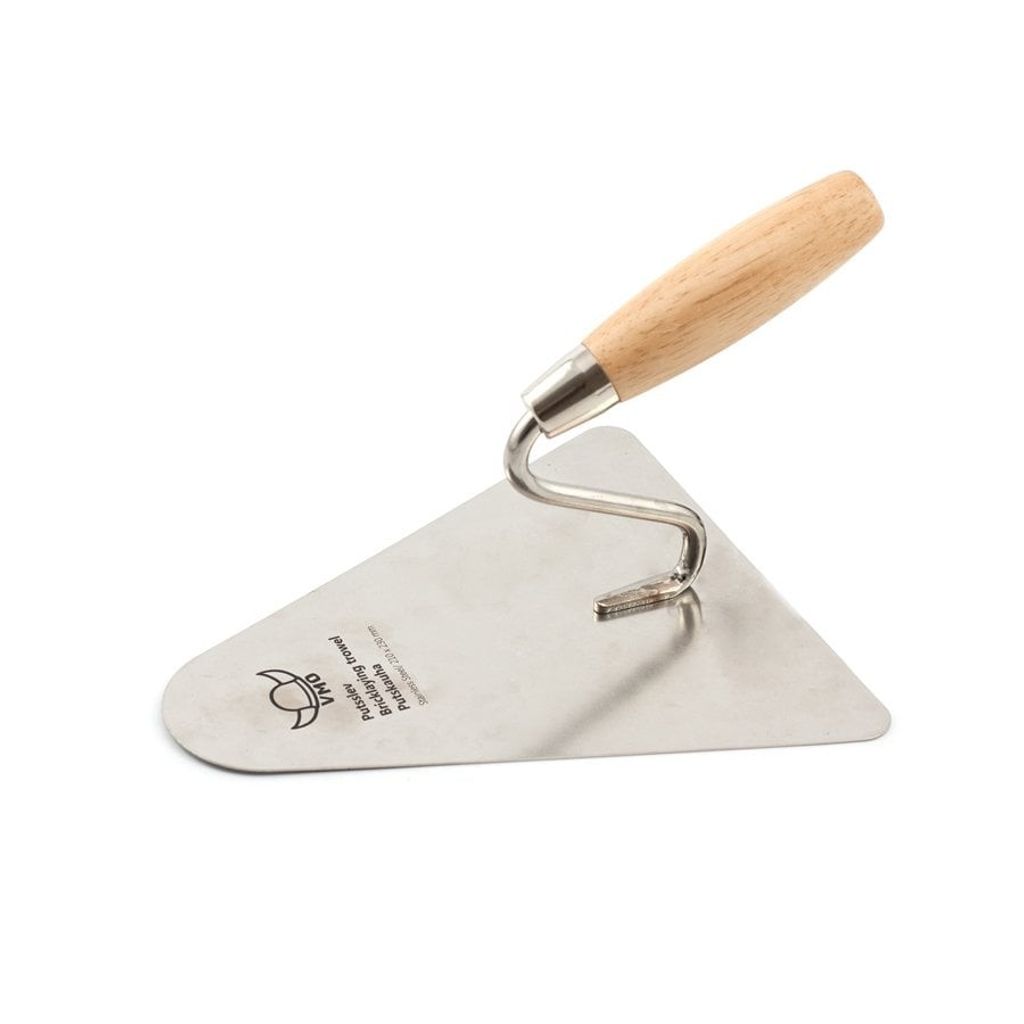 Trähandtag med blad i rostfritt stål. Svanhals för upphängning på kärl.