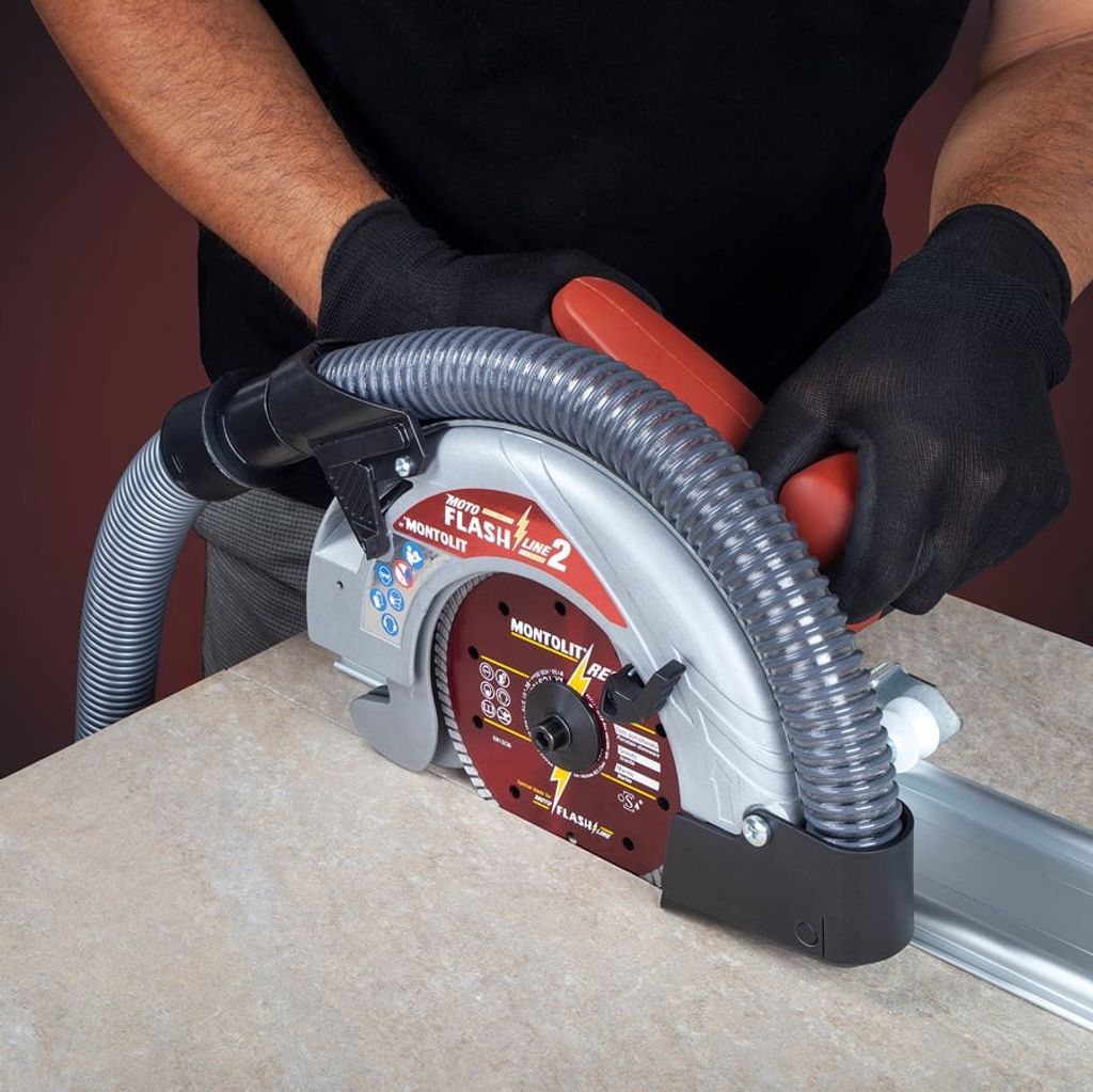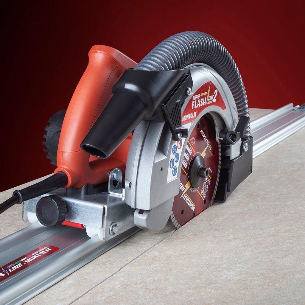 Sänksåg för kapning av storformatiga plattor. 1600 W. Dammsugaranslutning Ø 35 mm. 3 st 1200 mm styrskenor som kopplas ihop och ger en total skärlängd på upp till 3400 mm. Styrskenornas undersida har halkskydd för att ligga stadigt mot underlaget. Setet levereras i en praktisk förvaringsväska.