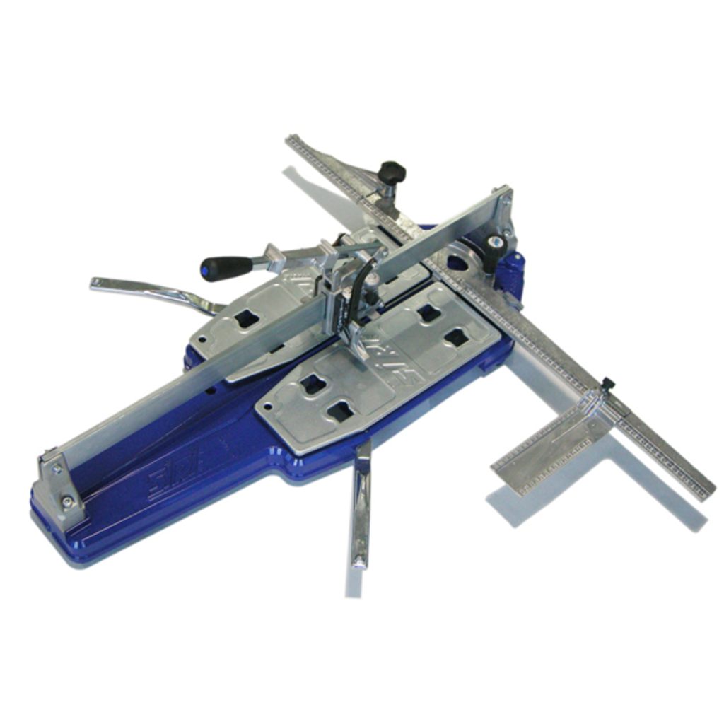 Skäraren har ett ergonomiskt aluminiumhandtag med 11 kullager som säkerställer exakta snitt, och knäckfötter med teflonskydd för att undvika repor på plattorna. Modellen levereras med rep, halksäkra gummifötter och infällbara, fjäderbelastade sidostöd, vilket gör den enkel att använda även för större plattor.