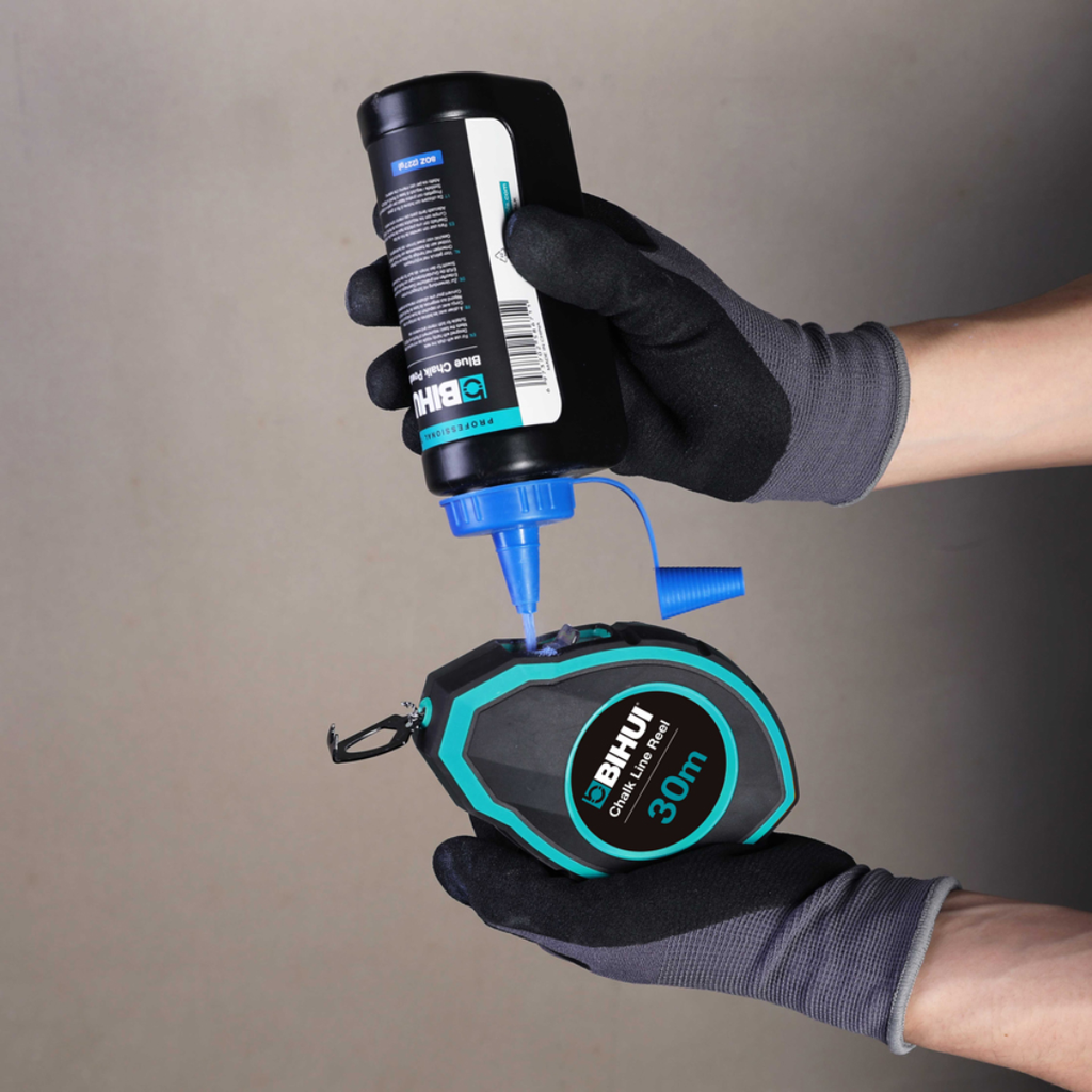 Snörslå med 30 m flätat, högabsorberande snöre av bomull och polyester. Trådhållfasthet på 20 kg. Rymmer 100 g krita. Vev av metall. Korken säkras av kroken i slutet av snöret.