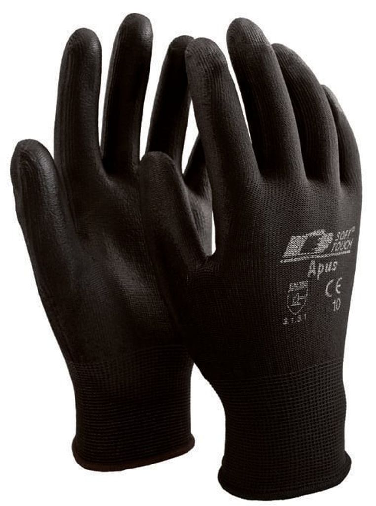 Soft Touch® Apus (AD-19) är en sömlös monteringshandske utvecklad för lättare arbeten där precision och fingertoppskänsla är viktigt. Handsken är stickad i nylon/polyester och doppad i svart PU i innerhanden och över fingertopparna, vilket ger ett stabilt och säkert grepp.