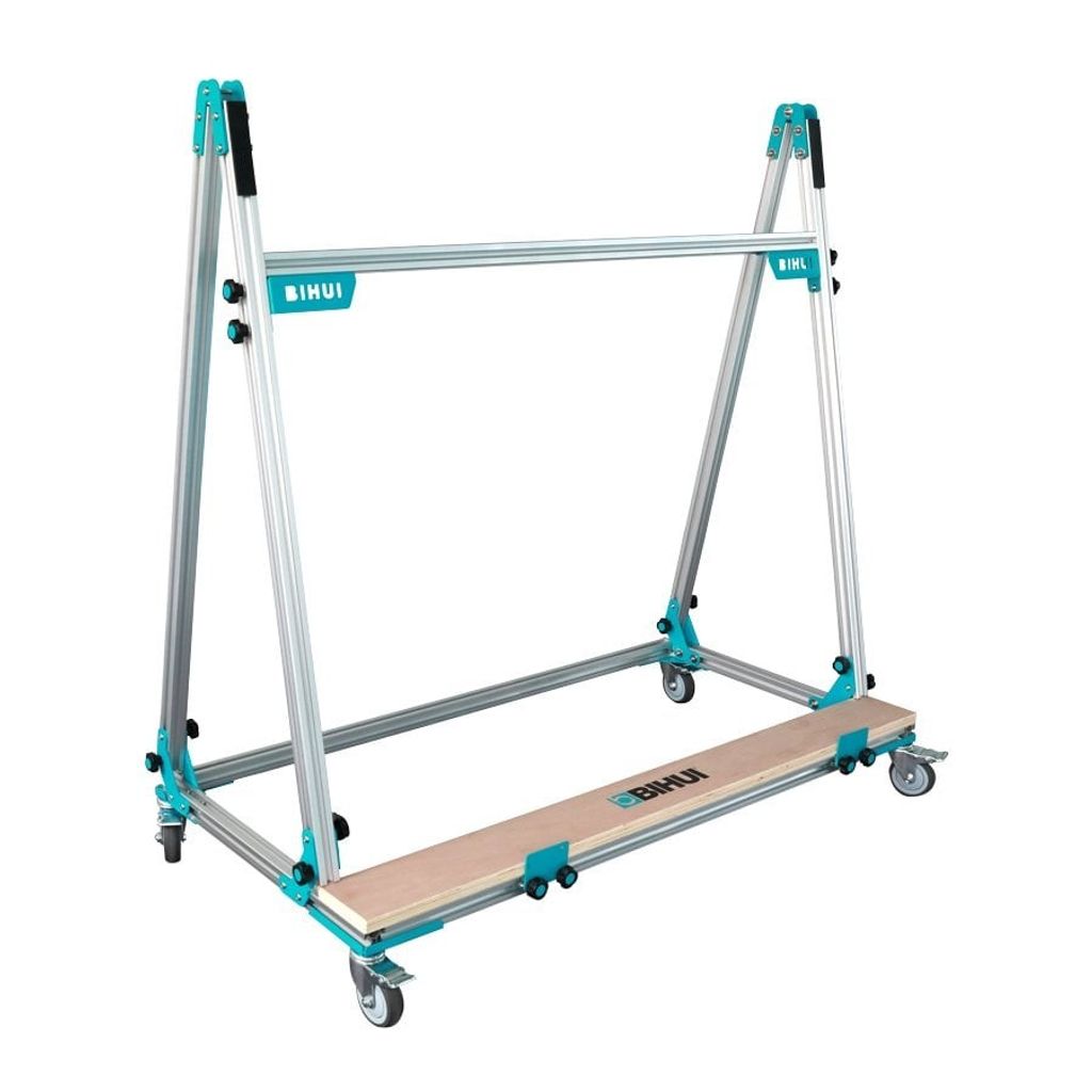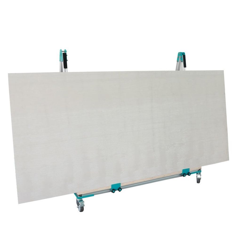 Vagn för transport av alla typer av storformatiga skivmaterial. Utrustad med 4 st låsbara hjul. Två krokar i den övre delen av vagnen för att hänga upp Plattlyft Bihui (ingår ej), vilket underlättar vid applicering av fix på plattan.